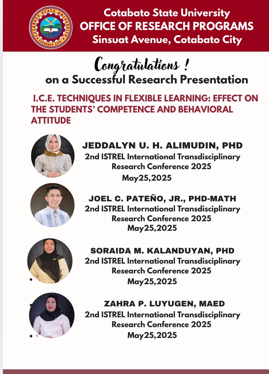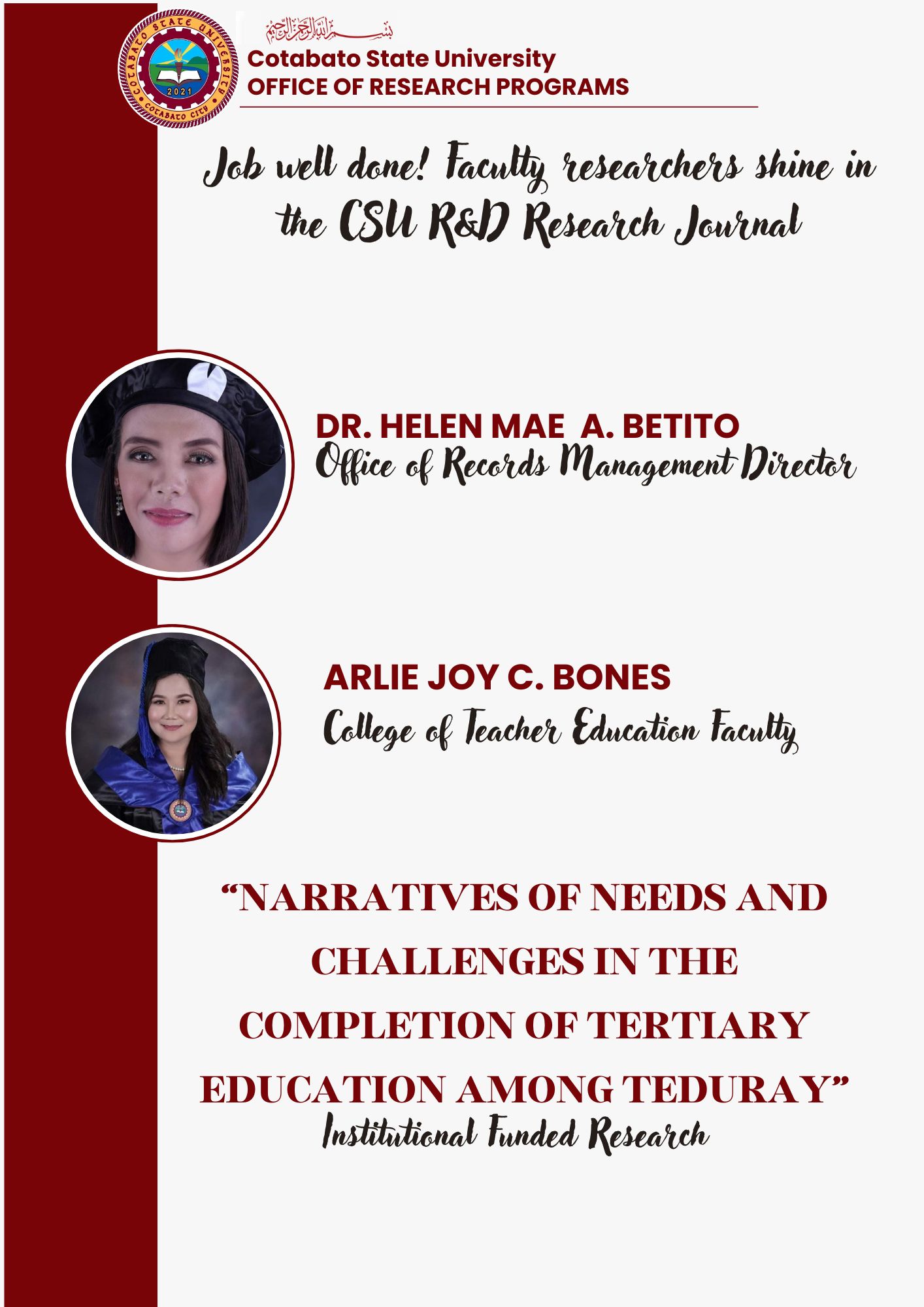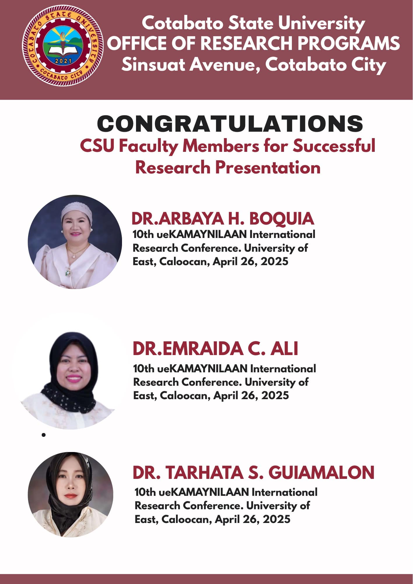 Graduate College was officially operational as a distinct academic unit of Cotabato City State Polytechnic College (CCSPC) on October 23, 1993 as per BOT Resolution No. 239 s. 1993 with initial offerings of Master of Arts in Industrial Education Management, Master of Public Administration and Master of Arts in Agricultural Extension. For 27 years, the Graduate College continuous to strive for excellence by fulfilling its mandated functions taking cognizance in achieving its goals and objectives through providing quality teaching and learning process. By virtue of RA 110131, CCSPC is now Cotabato State University (CSU) and its nomenclature is Graduate School per BOT Resolution No. s. 2021.